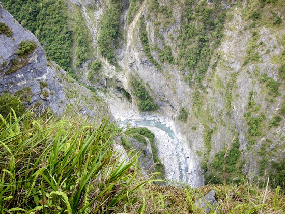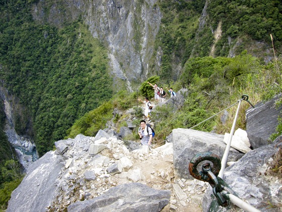 | ▲ 左下方便是立霧溪谷,此處坡度頗為陡峭,攀爬落腳之處可見許多大小石塊,懼高的人攀爬此處可能會有點軟腳唷... |