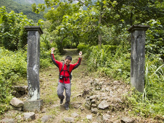 | ▲ 友人很開心地衝過了巴達岡駐在所的門柱,總算快走完了! |
